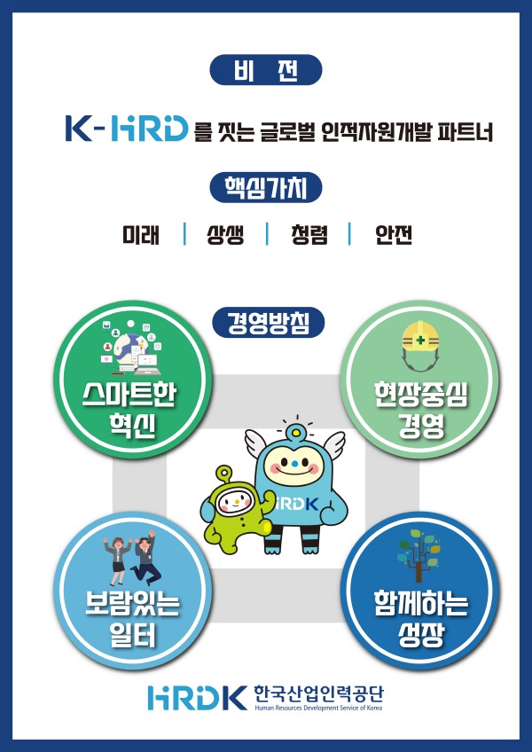 공단은 신(新)경영방침을 통해 디지털 기술을 조직 전반에 도입하여 대국민 서비스 제공 환경을 혁신하고(스마트한 혁신), 책임과 자율에 기반한 현장 중심 업무수행(현장중심 경영)을 통해 한국형 인적자원개발 전문 공공기관으로 선도적 위치를 확고히 할 계획이다. 또한 공단의 새로운 경영방침에는 공정한 보상이 이루어지는 기관 운영(보람있는 일터), 공단과 고객의 가치가 함께 동행하는 조직문화 구축(함께하는 성장)의 의지도 담겨있다.