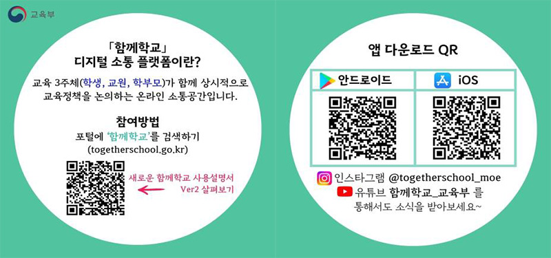 교육부는 이들이 자유롭게 의견을 개진하고 소통하면서 교육 정책을 발전시키고 신뢰와 존중의 문화를 회복할 수 있도록 디지털 소통 플랫폼인 ‘함께학교’를 지난해 11월 20일 개통했다. 그리고 지난 11일에는 교원뿐만 아니라 학부모와 학생을 대상으로 한 상담·소통 기능을 신설했다.