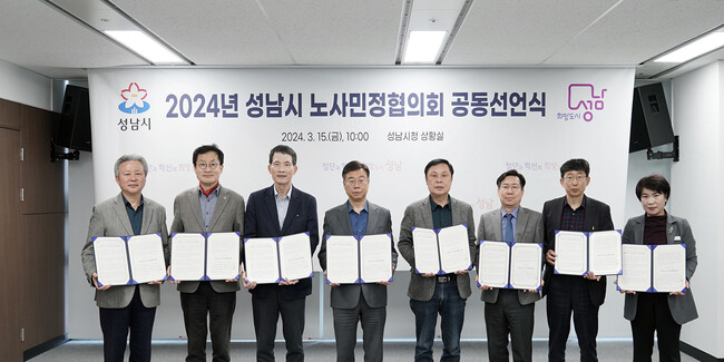 성남시는 15 일 오전 10 시 시청 상황실에서 2024 년 성남시 노사민정협의회 회의를 열어 상생형 일자리 구축과 지속가능한 ESG 도시 성남을 위한 노사민정 공동선언을 발표했다 .