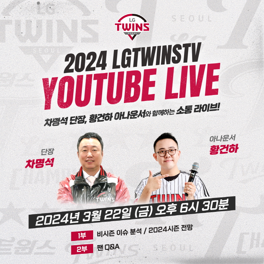 서울 LG트윈스는 3월 22일 오후 6시반부터 2024년 첫번째 유튜브 라이브를 진행한다. 이번 시즌 첫번째 유튜브 라이브는 차명석 야구단장과 황건하 장내 아나운서가 함께한다.