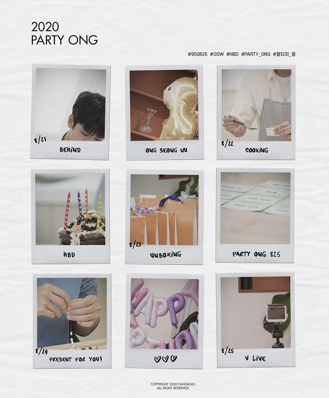 ‘2020 PARTY ONG(팔티이-옹)’은 옹성우의 생일인 8월 25일을 기념해 릴레이로 콘텐츠를 공개하는 온라인 생일 파티다. 오는 21일부터 5일간 진행되는 ‘2020 PARTY ONG(팔티이-옹)’은 21일 스페셜 비하인드를 시작으로 요리, 선물 언박싱, 답례품 만들기를 순차적으로 선보여 다채로운 생일 주간이 될 것을 예고했다. 특히 옹성우의 생일인 25일에는 실시간 V LIVE로 팬들과 만날 예정이다.