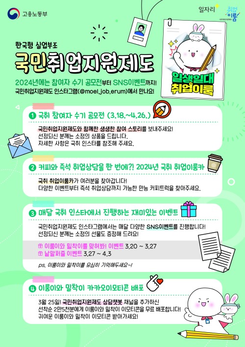 공모전, 취업이룸카, 온라인 참여형 이벤트 등에 대한 자세한 정보는 고용노동부 국민취업지원제도 인스타그램(@moel.job.erum)에서 확인할 수 있다.