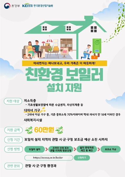 지원 대상 보일러는 가스 소비량 70kW 이하인 콘덴싱 가스보일러로 환경표지 인증을 받은 제품이며, 보일러 1대당 60만 원을 지원한다.