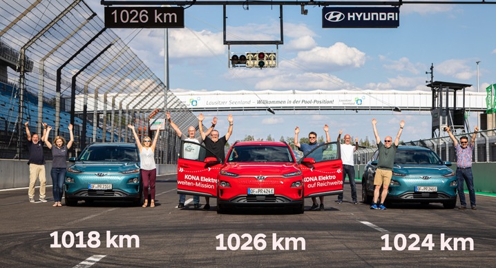 현대자동차는 코나 일렉트릭 3대가 지난 7월 22~24일(현지시간) 독일에서 실시된 시험주행에서 각각 1,026km, 1,024.1km 그리고 1,018.7km의 주행거리를 달성했다고 14일 밝혔다. 시험에서 연비는 1kWh당 16km 안팎으로 나타나 국내 기준 공인 전비(전기차 연비)인 5.6 km/kWh를 훌쩍 뛰어넘었다.