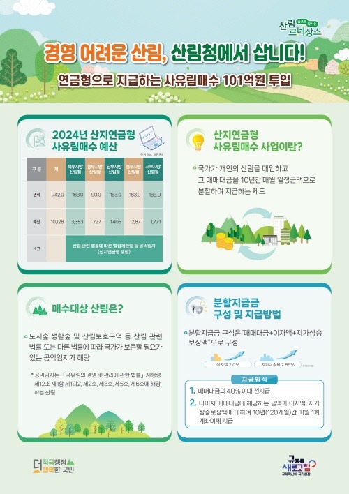 ‘산지연금형 사유림 매수사업’은 산주에게 매매대금을 10년간(120개월) 매월 지급하는 제도로 연금처럼 안정적 노후생활을 지원하기 위해 ’21년 시범 추진 이후 ’22년부터 본격적으로 시행되고 있다.