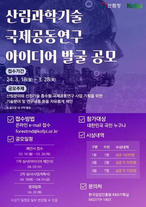 이번 공모전은 국민의 혁신적인 아이디어를 모아 산림과학기술 분야에서 국제공동연구가 필요한 과제를 발굴해 글로벌 경쟁력을 강화하는 데 목적이 있다.
