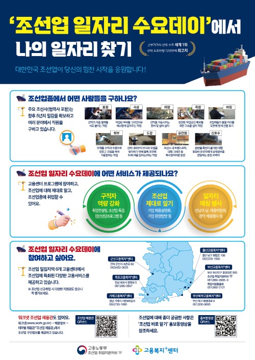 조선업 밀집지역의 고용센터(부산·부산북부·울산·거제·군산·목포)들도 「조선업 취업지원허브」를 중심으로 매월 3~4주에 「조선업 일자리 수요데이」를 공동개최하고 있다. 지역구분을 벗어나 취업컨설팅, 직무특강, 기업탐방, 채용행사 등 조선업에 특화된 취업·채용지원서비스를 광역 단위 릴레이 방식으로 제공해 나갈 계획이다.
