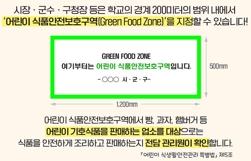 어린이 식생활안전관리 특별법」 제5조에 따라 시장·군수·구청장 등은 어린이를 보호하기 위해 학교 경계로부터 200미터의 범위에서 ‘어린이 식품안전보호구역(Green Food Zone)’을 지정할 수 있다.