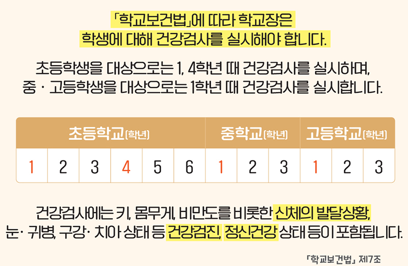 학교보건법 제7조에는 학교장이 학생에 대해 건강검사를 해야 한다는 사실과 그 시기가 규정되어 있다.
