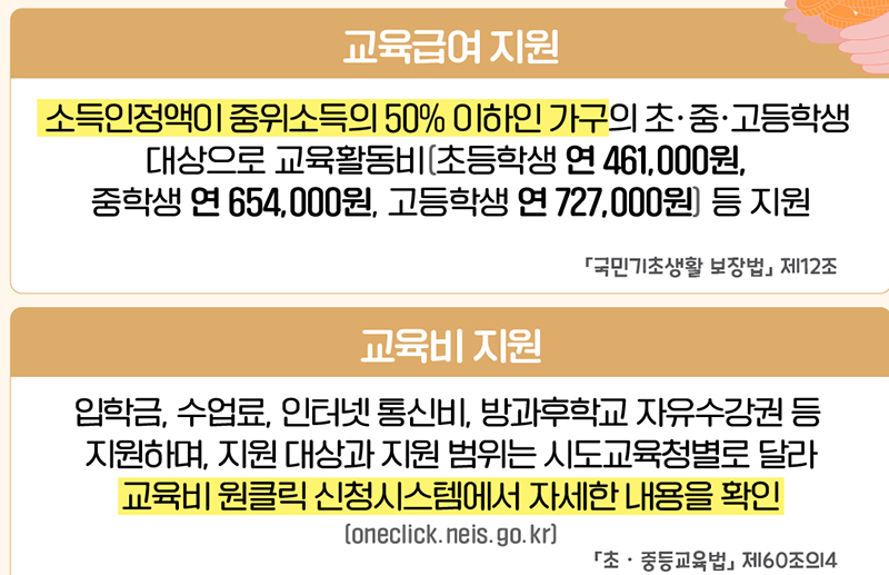 경제적으로 어려움을 겪고 있는 가구의 초·중·고교생에게 교육급여를 지급한다.
