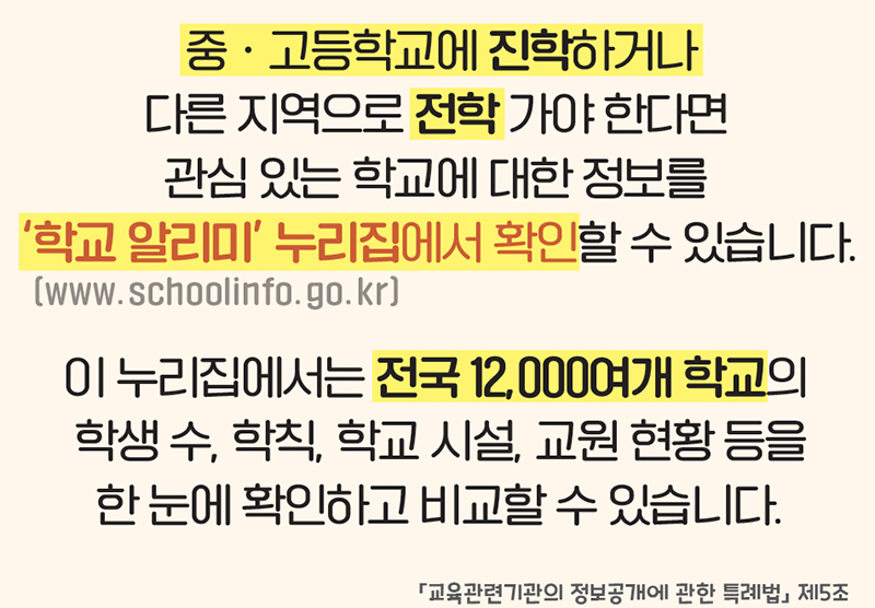 이 법에 따라 공개된 전국 1만 2000여개 학교의 학생, 교원, 시설, 교육 환경 등 자세한 정보는 학교 알리미 누리집( www.schoolinfo.go.kr )에서 확인할 수 있다.