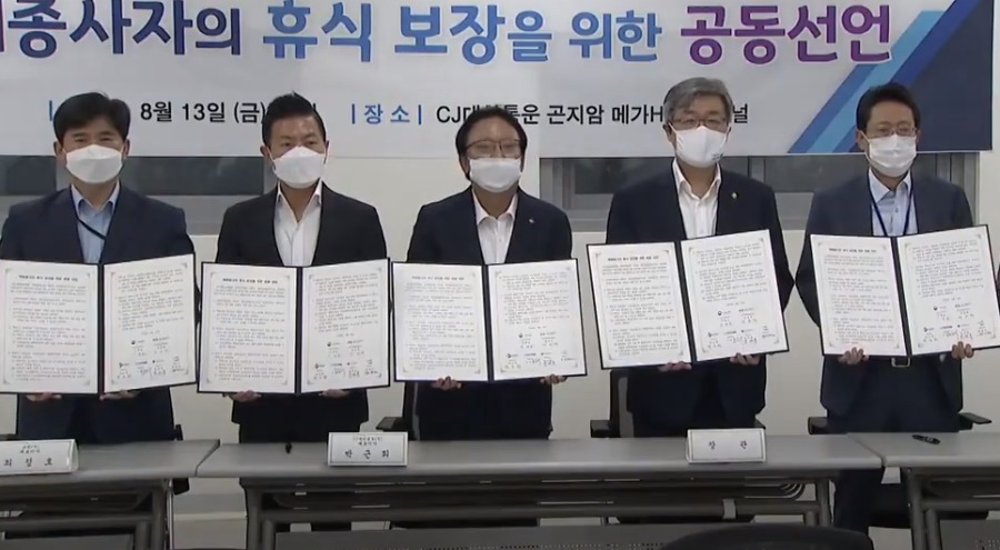 한편 이날 공동선언식 이후에는 CJ대한통운(주)의 건강관리와 안전보건 조치 등에 관한 사례를 공유하고 택배 종사자들의 휴식이 있는 삶을 지원하는 방안 등에 대한 토의도 이어졌다.
