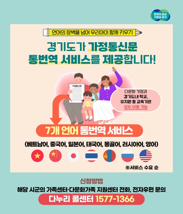 경기도가 다문화가정을 위해 학교를 비롯한 교육기관의 가정통신문(알림장 등) 통번역 서비스를 제공한다며 많은 이용을 당부했다.