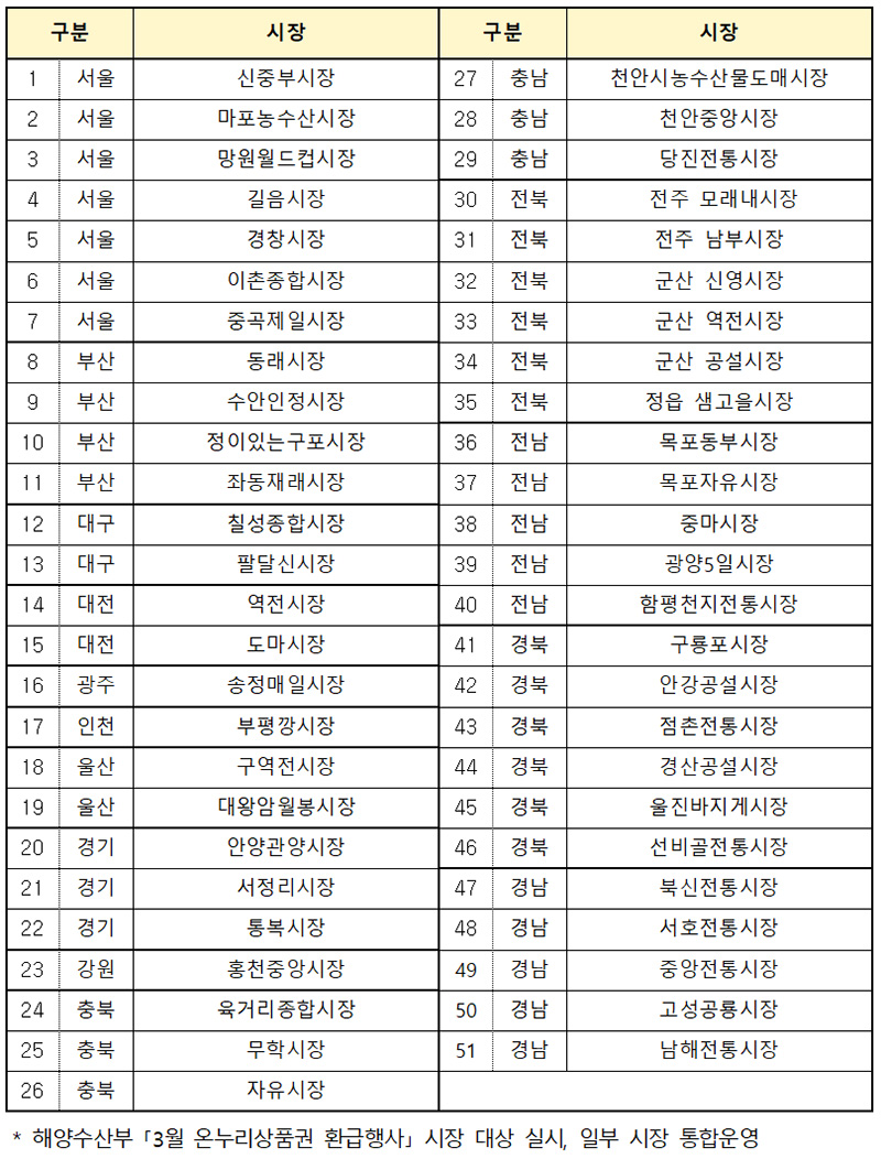 농림축산식품부는 20일부터 22일까지 전통시장의 농축산물 소비자 물가부담 완화를 위해 전국 전통시장 51곳에서 ‘3월 전통시장 온누리상품권 환급행사’를 개최한다고 밝혔다.