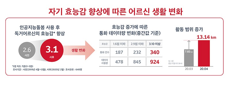 특히 주목할 점은 어르신들이 ‘인공지능 돌봄’을 이용하면서 자기 효능감이 향상됐다는 것이다. 이는 어르신들의 통화량 증가 및 활동 범위 확대로 이어졌다. 자기 효능감이 높아지면서 통화 건수 및 데이터 사용량이 급증했고, 일 평균 이동 거리도 2배 가량 늘어났다.
