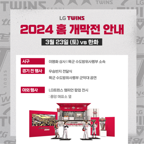 서울 LG트윈스는 3월 23일 잠실야구장에서 한화이글스를 상대로 2024시즌 홈 개막전을 진행한다.