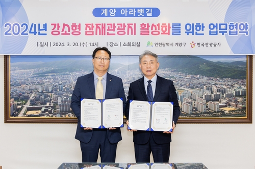 인천광역시 계양구는 지난 20일 구청 소회의실에서 한국관광공사와 '강소형 잠재관광지 활성화'를 위한 업무협약을 체결했다고 밝혔다.