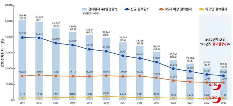 2023년 국내 결핵환자는 1만 9540명이 발생해 전년 대비 4.1% 감소했하면서 2011년 최고치 이후 12년 연속 결핵환자 발생 감소세를 이어갔다.