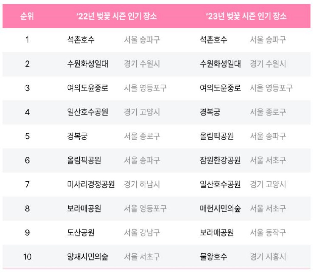 이 밖에도 SKT는 ‘22년과 ‘23년의 벚꽃 시즌 데이터를 분석하여 가장 많이 찾았던 전체 방문객 수 Top 10과 연령대별 인기 장소 Top 5를 공개했다.