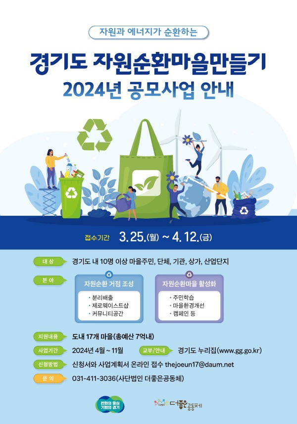 경기도는 쓰레기 감량과 자원순환 실천 및 탄소중립 실현을 위해 ‘2024년 경기도 자원순환마을 만들기사업’에 참여할 마을을 4월 12일까지 공개 모집한다.