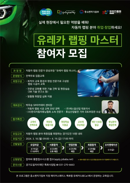 경기도일자리재단이 도내 자동차 랩핑 전문인력을 양성해 관련 분야로 취․창업을 지원하는 ‘유레카 랩핑 마스터 과정’ 참여자를 모집한다.
