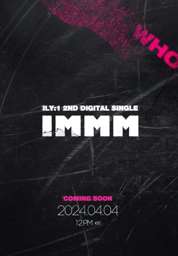 공개된 이미지는 스크래치가 난 짙은 회색 배경과 함께 중앙에 적혀있는 ‘IMMM’이란 문구가 와일드한 느낌을 더하며 강렬한 인상을 안긴다. 특히 이미지 우측에 진한 핑크빛으로 적힌 ‘WHO’라는 문구가 무슨 의미가 있을지 보는 이들의 궁금증을 자극시킨다.