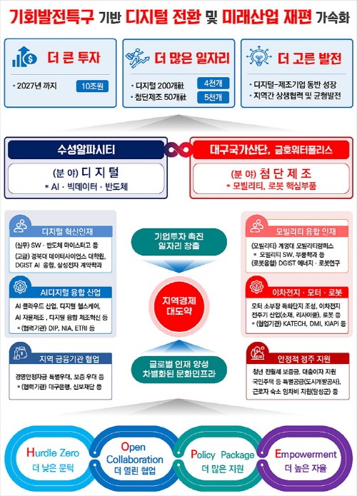 대구광역시는 지난 3월 4일(월) 열린 대구지역 민생토론회에서 대통령의 ‘동부권의 수성알파시티 국가디지털혁신거점 조성과 서남부권 모빌리티·로봇 중심의 산업 재편’ 약속에 적극 부응하기 위해 전국에서 가장 발 빠르게 기회발전특구 지정을 신청했다.