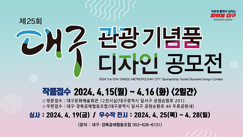 조경선 대구광역시 문화체육관광국장은 “올해로 25회를 맞이하는 대구관광기념품·디자인 공모전을 통해 대구만의 차별화된 우수한 작품들을 많은 분들이 출품해 주시길 당부드린다”며, “관광도시 대구를 널리 알리고 누구나 구매하고 싶은 관광기념품을 발굴, 육성하기 위해 적극 노력하겠다”고 말했다.