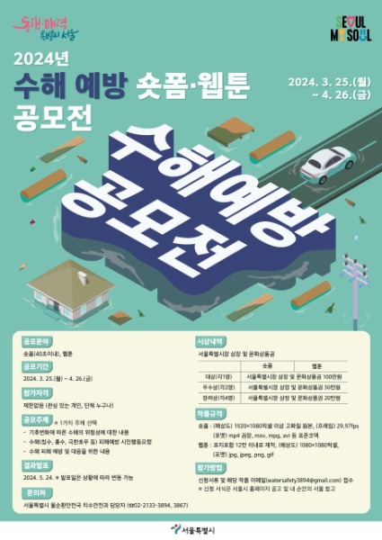 서울시는 오는 4월 26일(금)까지 전 국민을 대상으로「2024년 서울특별시 수해 예방 콘텐츠 공모전」을 개최한다고 밝혔다.