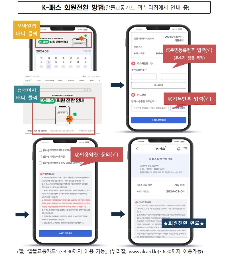 다음 달 30일까지 전환을 완료한 이용자는 K-패스가 시행되는 5월 1일부터 즉시 K-패스 혜택을 적용받고, 전환을 미리 완료하지 않은 이용자는 회원 전환을 완료하기 전까지 K-패스 환급 혜택을 받을 수 없다.