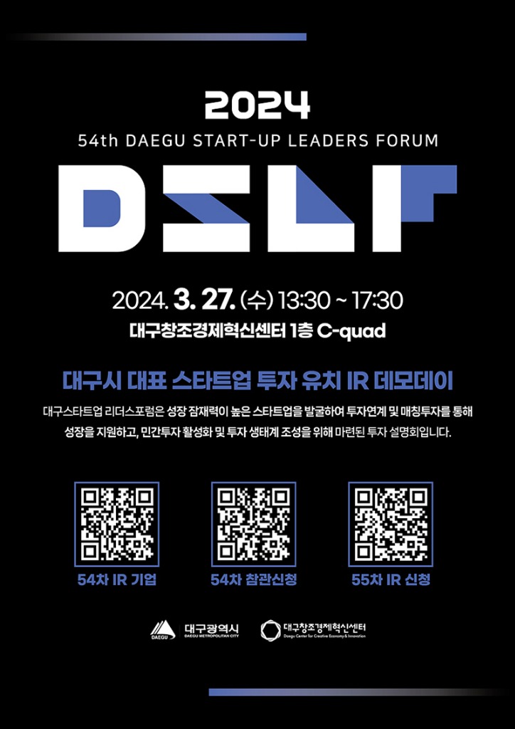 대구광역시는 지역의 대표적인 투자설명회로 자리 잡은 대구스타트업 리더스포럼을 3월 27일(수) 오후 1시 30분 대구창조경제혁신센터에서 개최한다. 변화된 지역 창업환경에 맞춰 에인절 투자뿐만 아니라 민간투자 전체를 아우르는 모습으로 운영된다.