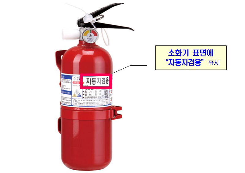 한편 차량용 소화기는 일반분말소화기의 성능시험뿐만 아니라 진동시험과 고온시험으로 부품이탈·파손·변형 등 손상이 없는 것까지 검증된 소화기를 의미하며, 소화기 용기 표면에 ‘자동차 겸용’ 표시가 돼 있다.