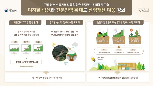 둘째, ‘국가산림위성정보활용센터’를 신설(5.1)하여, 첨단 위성기술을 활용한 융복합 산림재난 연구를 추진한다. 특히, 매일 한반도를 관측하는 위성 데이터를 활용하여 산불·산사태·산림병해충 등 산림재난의 징후를 실시간으로 탐색한다. 이를 통해 산림재난에 신속히 대응하고, 재난 지역의 피해복구 계획 수립 등 2차 피해를 최소화할 예정이다.
