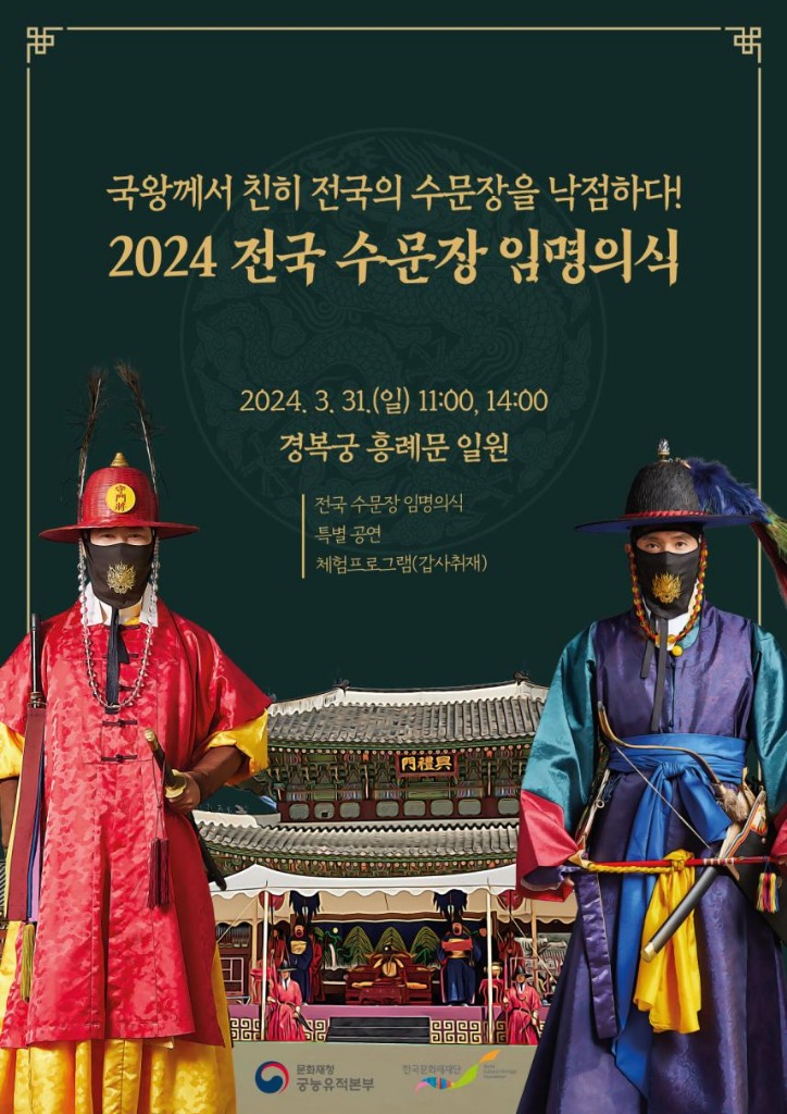 문화재청 궁능유적본부는 한국문화재재단과 오는 31일 오전 11시와 오후 2시 두 차례에 걸쳐 경복궁 흥례문 일원에서 전국의 수문장들에게 임명장을 수여하는 ‘국왕께서 친히 전국의 수문장을 낙점하다!’ 행사를 개최한다.