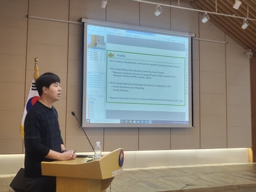 이를 위해 이번 세미나에서, 미국 오레곤주립대의 주석현 박사가 대표 용재수인 미송 육종과 목재 수확량 예측 연구에 대해 발표하는 시간을 가졌다. 주 박사는 임업 선진국인 미국의 대규모 임업 현장에서 적용하고 있는 육종 방법과 결과를 공유하였다.
