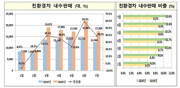 친환경차뿐 아니라 전체적인 자동차 내수 판매는 코로나19 여파 속에서도 3월(10.1%), 4월(8.0%), 5월(9.7%), 6월(42.0%)에 이어 5개월 연속 증가세다.