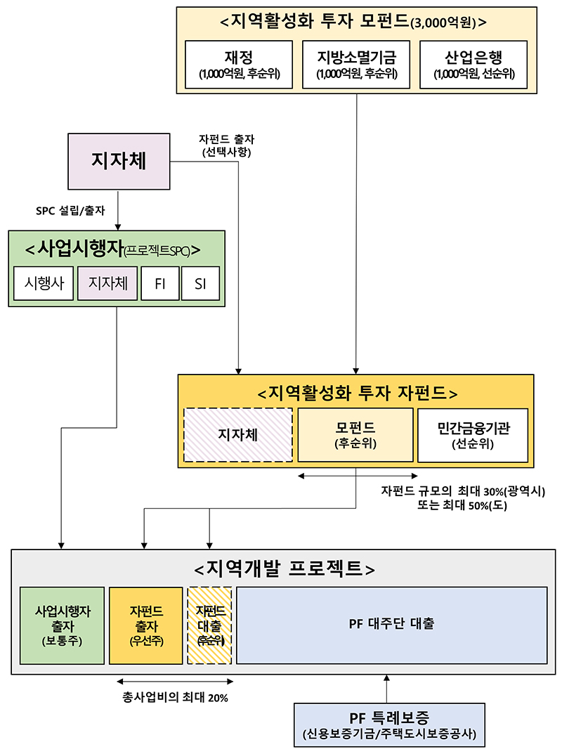 이에 지자체에서 지역활성화 투자 펀드를 다양하게 활용할 수 있도록 충분한 규모의 모펀드 조성, 획기적 규제개선, 전용 특례보증, 지자체 컨설팅 등을 적극 지원한다.