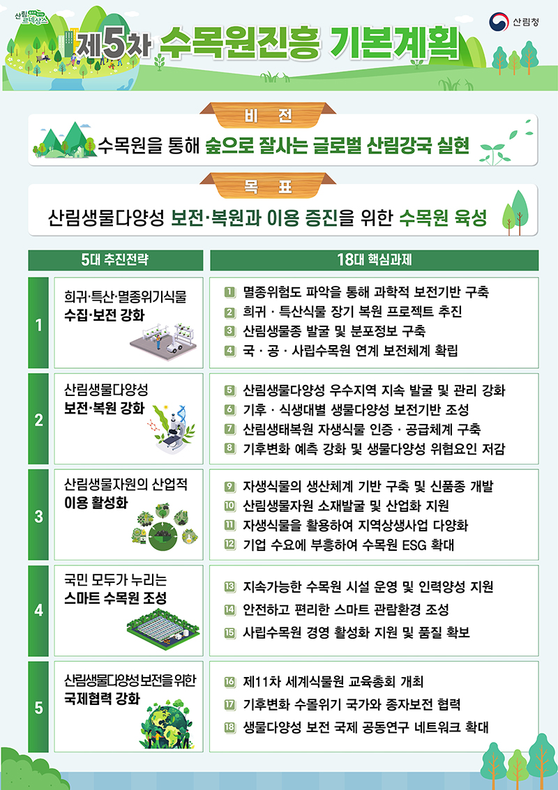 이번 5차 수목원진흥기본계획은 ▲희귀·특산·멸종위기식물 수집 및 보전 강화 ▲산림생물다양성 보전·복원 강화 ▲산림생물자원의 산업적 이용 활성화 ▲국민 모두가 누리는 스마트 수목원 조성 ▲산림생물다양성 보전을 위한 국제협력 강화 등 5대 추진전략과 18대 핵심과제를 담고 있다.
