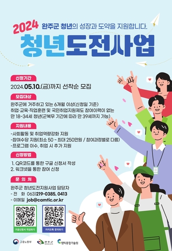 완주군 청년 도전 지원사업은 고용노동부 공모사업 선정에 따른 것으로 청년들에게 맞춤형 프로그램을 제공해 자신감 회복, 진로 탐색, 취업 역량 강화 등을 돕고 노동시장 참여 등을 유도한다.