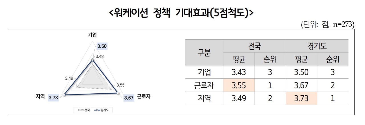 설문조사 결과, 관광숙박 사업체는 워케이션에 대한 정책적 지원 필요성에 공감하고 있으며, ‘참여기업 지원(기업 세제 혜택 등)’과 ‘시설 지원(업체 내 숙박시설 개선 등)’을 최우선 개선과제로 꼽았다. 워케이션 정책의 기대효과를 기업, 근로자, 지역 측면으로 나누어 살펴봤을 때, 근로자 측면의 기대효과는 3.55점(5점 척도)으로 가장 높게 나타났다. 하지만 전체 조사 결과와 달리, 경기도 업체들은 근로자 측면(3.67점)보다는 지역적 측면(3.73점)의 기대효과를 중요하게 생각하고 있었다. 이는 경기도 지역 활성화 정책 중 하나로 워케이션을 의미 있게 살펴볼 필요가 있음을 시사한다.
