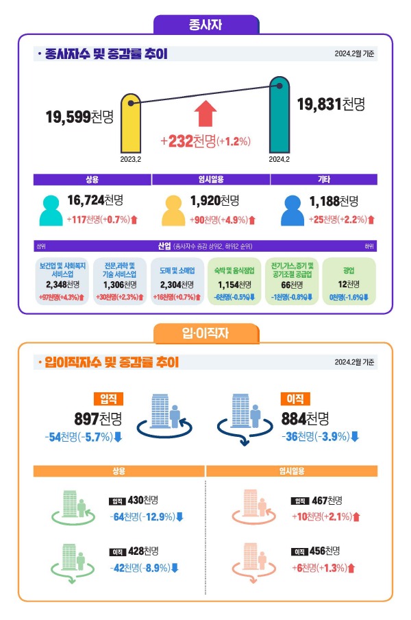 (총괄) ’24.2월 마지막 영업일 현재, 종사자 1인 이상 사업체의 종사자는 19,831천명으로 전년동월(19,599천명)대비 232천명(+1.2%) 증가