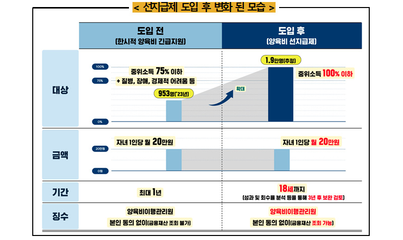 한부모가족 양육비 선지급제는 기존의 ‘한시적 양육비 긴급지원’을 확대·전환하는 것으로, 중위소득 100% 이하 가구의 18세 이하 미성년 자녀를 대상으로 월 20만 원의 양육비를 18세까지 지원하는 것이다.