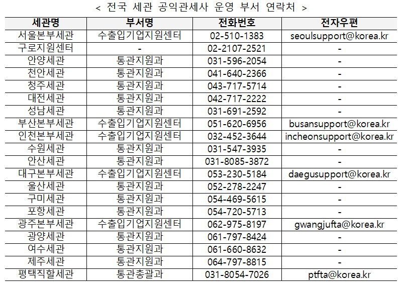 공익관세사에게 도움을 받고자 하는 기업은 전국 세관 20곳 공익관세사 운영 부서에 전화 또는 전자우편으로 문의하면 된다.