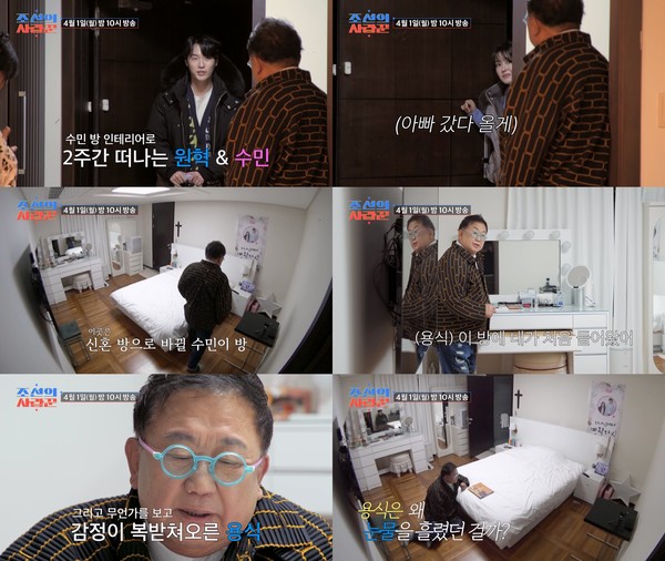 4월 1일(월) 방송될 ‘조선의 사랑꾼’에서는 이용식의 딸 이수민이 결혼과 합가를 앞두고 집 인테리어 공사 때문에 2주간 원혁의 집으로 떠난다. 아빠를 걱정하는 눈빛을 남긴 이수민에 착잡해진 이용식은 자연스레 발걸음을 이수민의 방으로 옮겼다.