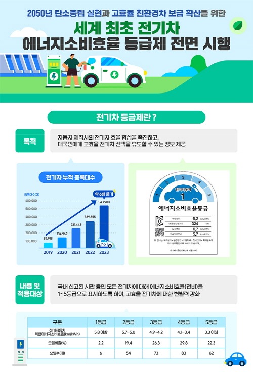 산업통상자원부는 전기차 에너지효율 등급제가 전면 시행됨에 따라 국내 시판 중인 278개 모델의 모든 전기차에 대해 5단계 등급으로 구분된 전기차 등급 라벨을 부착하게 된다고 1일 밝혔다.