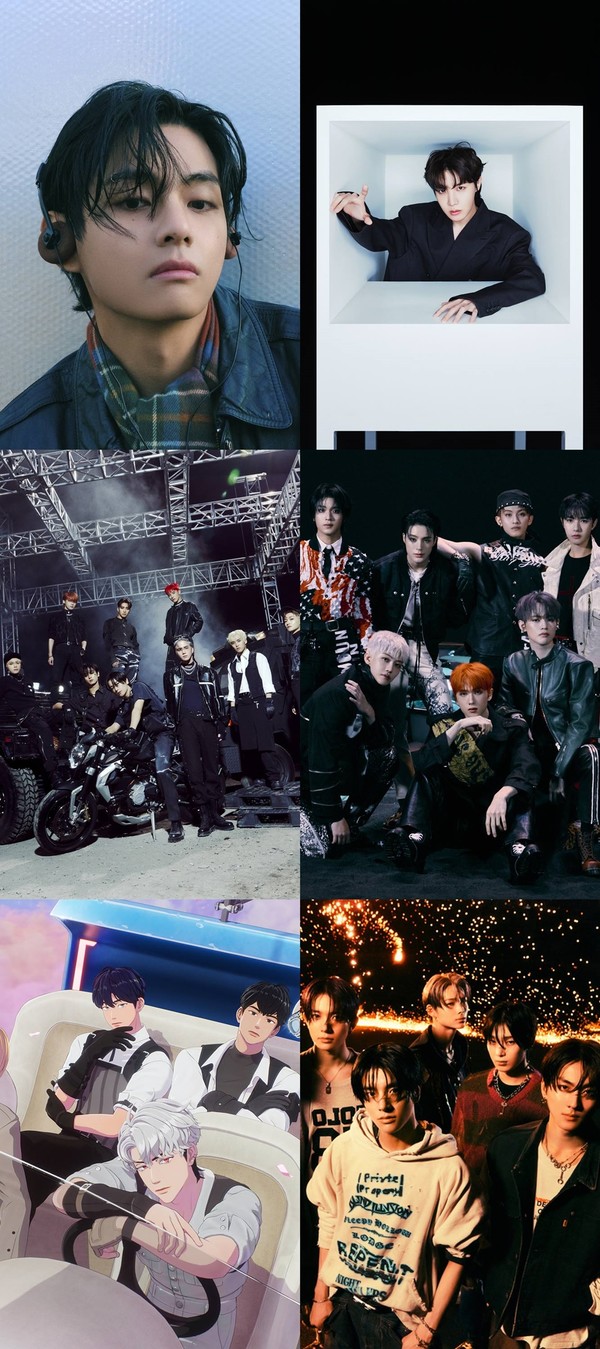 [사진 = 빅히트 뮤직, 쏘스뮤직, IST엔터테인먼트, SM엔터테인먼트, VLAST 제공 (왼쪽부터 시계방향으로 방탄소년단 뷔, 방탄소년단 제이홉, NCT DREAM, 엔하이픈, 플레이브, 더보이즈)]
