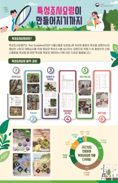 우리나라에서는 그동안 황금색 소나무, 검은색 감, 다양한 크기와 무늬를 가진 표고 등 특색있는 수많은 산림 신품종들이 개발되어 특성조사요령을 기반으로 출원되고 심사되고 있었으며, 산림청 국립산림품종관리센터는 육종가를 비롯한 일반 국민들을 대상으로 출원 수요조사와 자원의 잠재적 가치 평가 등을 반영하여 특성조사요령을 제정하는 적극행정을 실천하기 위해 노력하고 있다.