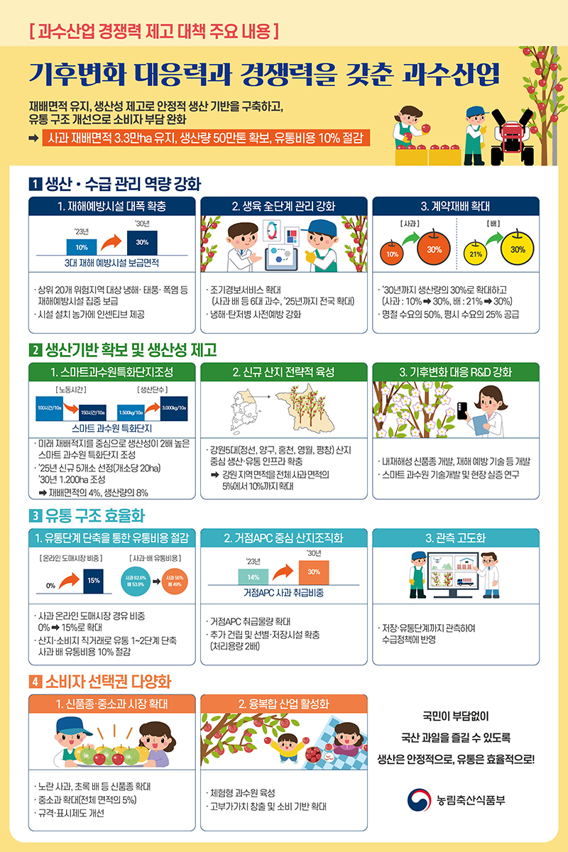 중장기적으론 기후 변화에 따른 재해 피해 증가 등의 영향이 커질 것에 대비해 재해예방시설을 확충하는 한편, 생산성이 2배 이상 높은 스마트 과수원 특화 단지도 조성한다.