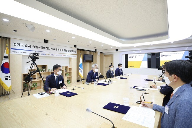 이재명 지사는 24일 경기도청 상황실에 안상준 코오롱인베스트먼트 대표, 심동욱 포스코기술투자 대표, 박상선 스마일게이트인베스트먼트 부사장, 박기호 한국소재부품장비투자기관협의회 회장, 김기준 경기도경제과학진흥원장과 함께 ‘경기도 소부장산업 투자활성화를 위한 협약’을 체결했다.