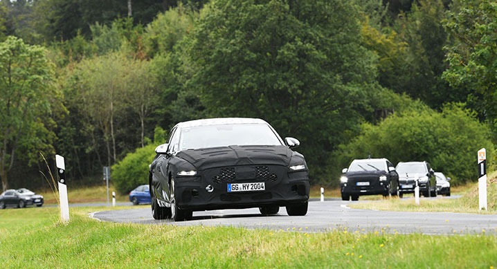 이 자리에는 연구개발본부 알버트 비어만 사장을 비롯해 디자인담당 루크 동커볼케 부사장, 제품통합개발, 아키텍처, 섀시, PM, 내구, 파워트레인, NVH 부문 임원과 현대자동차의 제품 기획과 운영을 담당하는 상품본부의 토마스 쉬미에라 부사장, 유럽 권역의 현대자동차·기아자동차·제네시스 상품 담당자 등 20여 명이 참석했다. 이번에 테스트한 모델은 제네시스 ‘G70’, ‘JX(개발명)’, ‘RG3(개발명)’와 현대자동차의 ‘벨로스터 N’, ‘i30 N line’ 그리고 기아자동차 SUV ‘XCeed’ 등 모두 6차종과 다른 브랜드의 경쟁 차종이다.